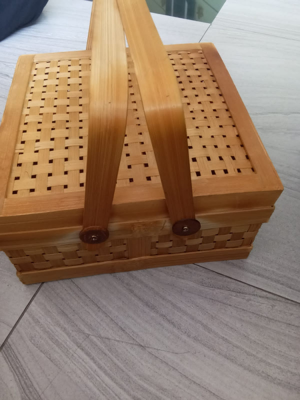 Kotak hampers memiliki 25×25 cm ini memiliki jinjingan sehingga bisa digunakan juga sebagai rantang untuk berpesta di alam terbuka.